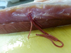 大型の寄生虫|寄生場所| 筋肉、体腔にとぐろを巻いたように寄生する。
