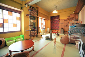 ネコスペースはオシャレな和室仕様。壁の天井に近い位置にはキャットウォークが張り巡らされ、何匹かがそこでお昼寝中。敷居をまたぐと、ハチワレ猫の姫ちゃん(メス・1歳)をはじめ何匹かが出迎えてくれました。