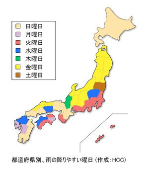 青が雨降りやすい曜日で赤が降りにくい曜日らしい
