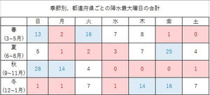 雨の降りやすい曜日が季節ごとに変わっているようです。そして、降りやすい曜日と降りにくい曜日に大きな差があることにも注目したいです!