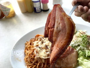運ばれてきた料理を見て「デラックス」の意味を理解した。ナポリタンに乗せられたトロトロの焼きチーズとポテサラ。そして、その山の周りを一周するほどデカいベーコン。ボリューム半端ねェェェエエエ!