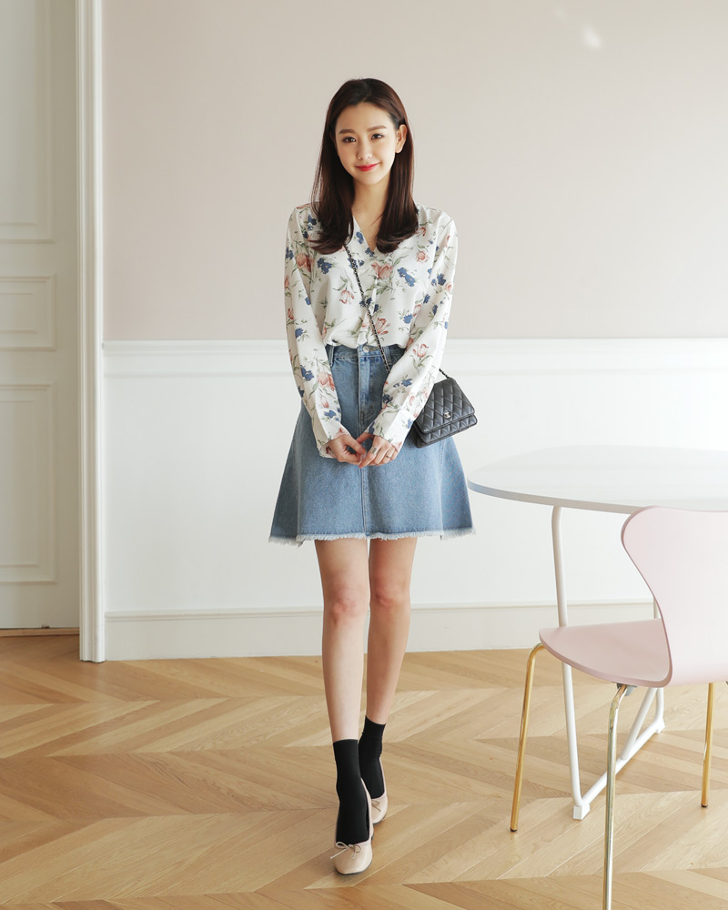 ▼フリルディテールバンドカラーデニムブラウス・全2色