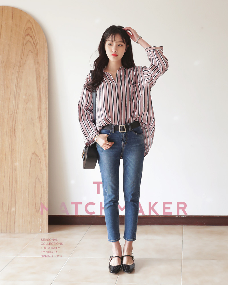 ▼ワイドスリーブVネックストライプブラウス・全3色