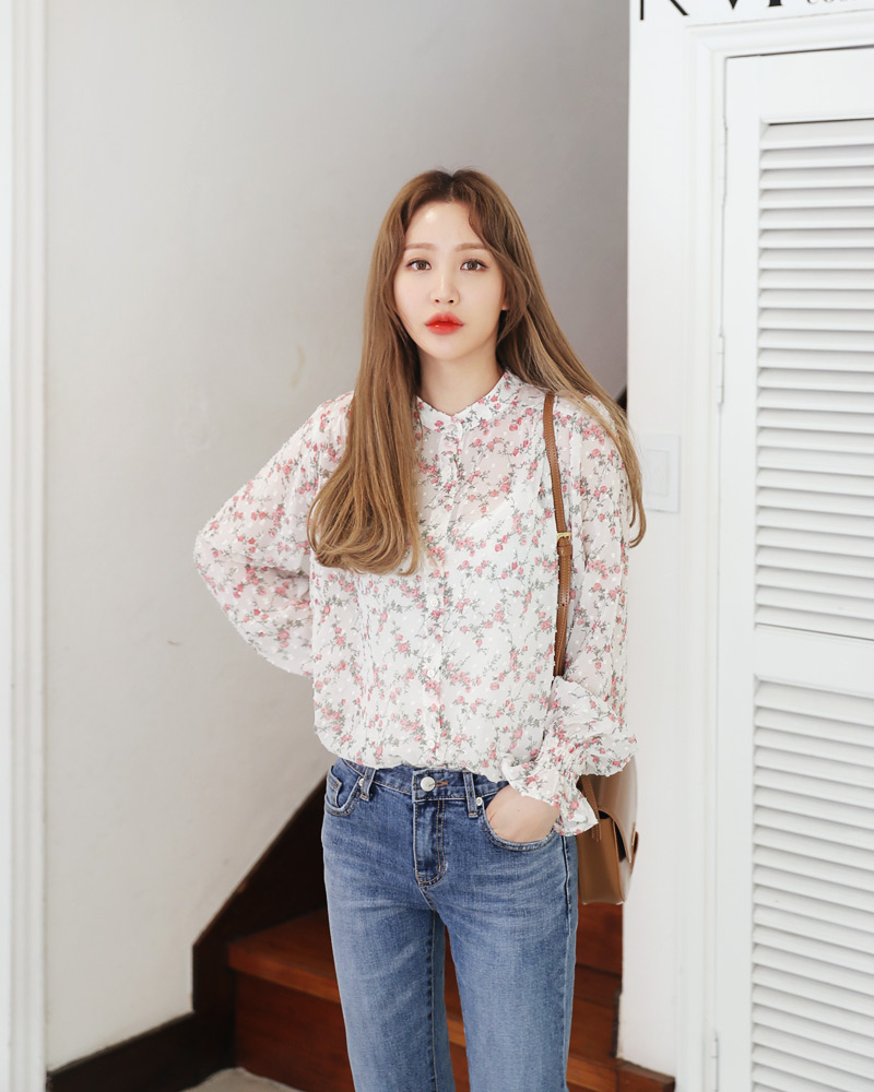 ▼バンドカラーエンボスドットフローラルブラウス・全2色