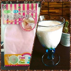 専用袋の中にフルーツと牛乳を入れ、手で揉むだけでジュースが作れる100均の「手もみジューサー」。