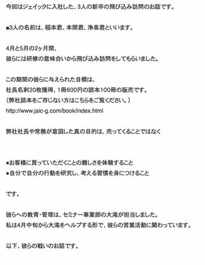 彼らには研修の意味合いから飛び込み訪問をしてもらいました。この期間の彼らに与えられた目標は、