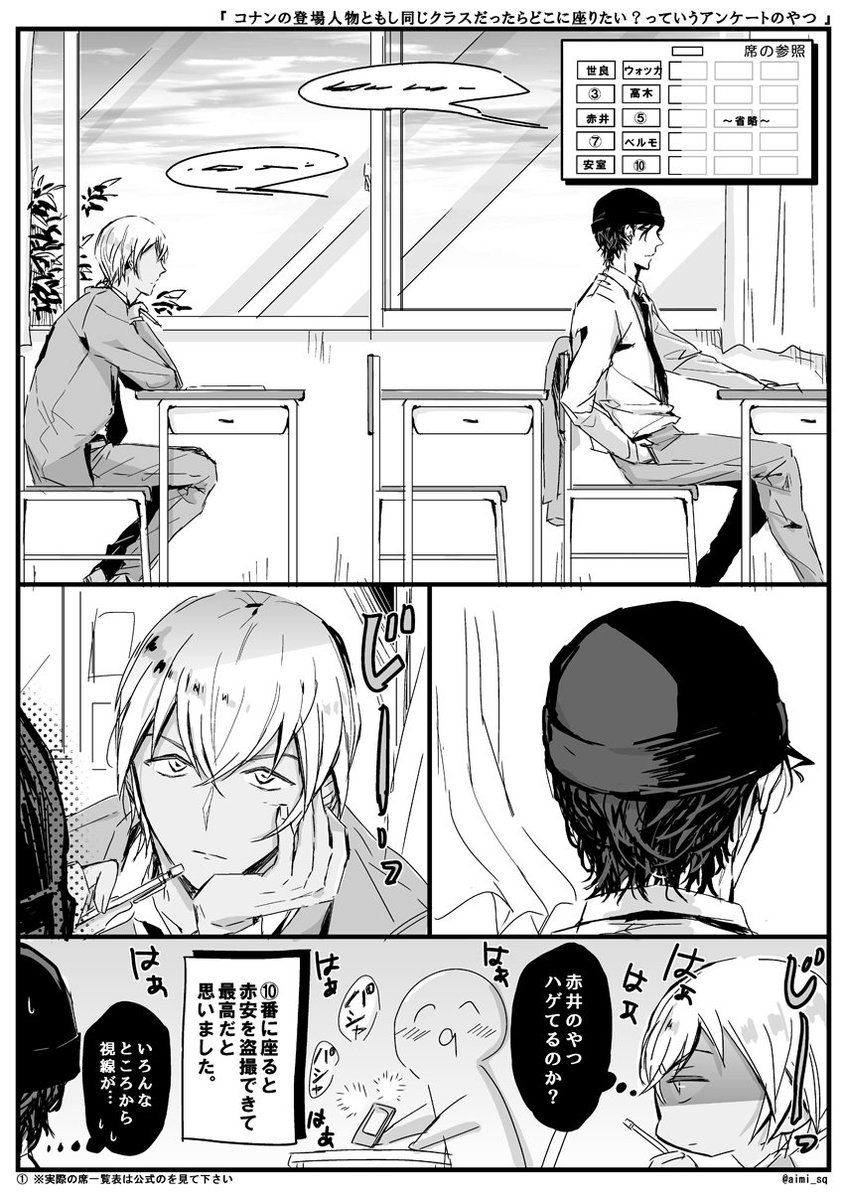 【落書き赤安】コナンの登場人物ともし同じくクラスならどこに座りたい?っていうちょっと前に流れてきたアンケの感想絵。これも当時描いて上げるの忘れてた 結局どこの席が人気だったんだろう~