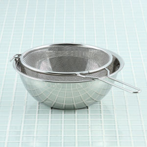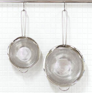目つまりしにくく、丈夫で清潔な、持ち手付きの穴あきザル。金網のざると違い、ステンレスの一枚板に細かい穴をあけたパンチング鋼板を使用していますので、丈夫で歪みづらく、洗いやすく清潔で、幅広の縁は持ちやすく高級感があります。取っ手の反対側には引っ掛ける部分がありますので、パンチングボウルより大きなサイズの鍋やボウルにも合わせられます。こちらは、ブロッコリーやにんじんなど、温野菜の水切りなどにピッタリの小さ目サイズです。ほかに、ハンドル無しのタイプもあります。