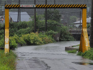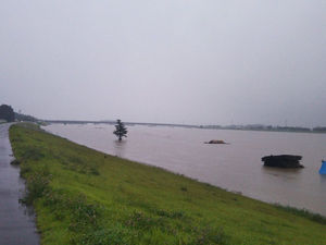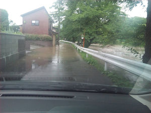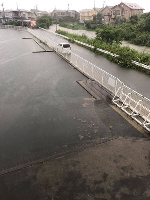 実質川の氾濫はまだだけど、堤防手前の水捌けの悪い道路が冠水してました。