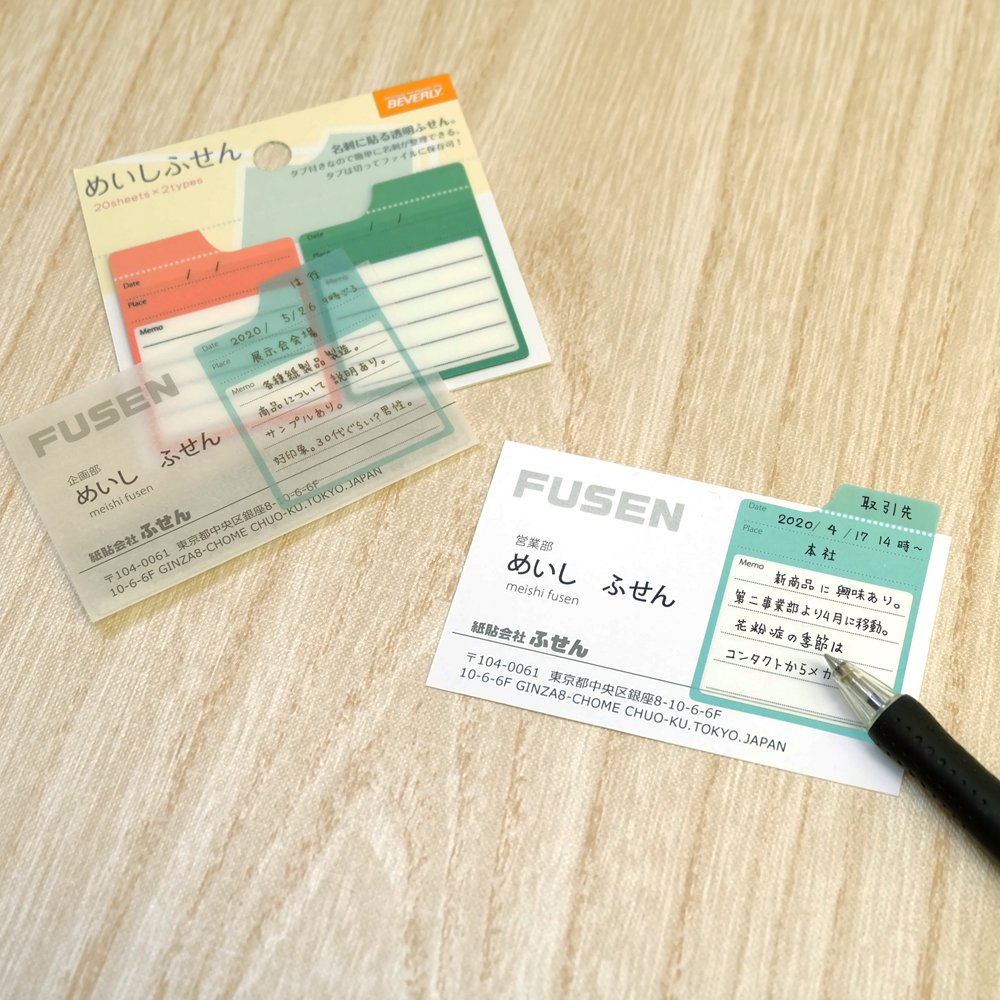 名刺にレイヤーのように半透明のふせんを貼って管理。ビバリーが名刺に直接メモしたくない人向けに、「めいしふせん」発売