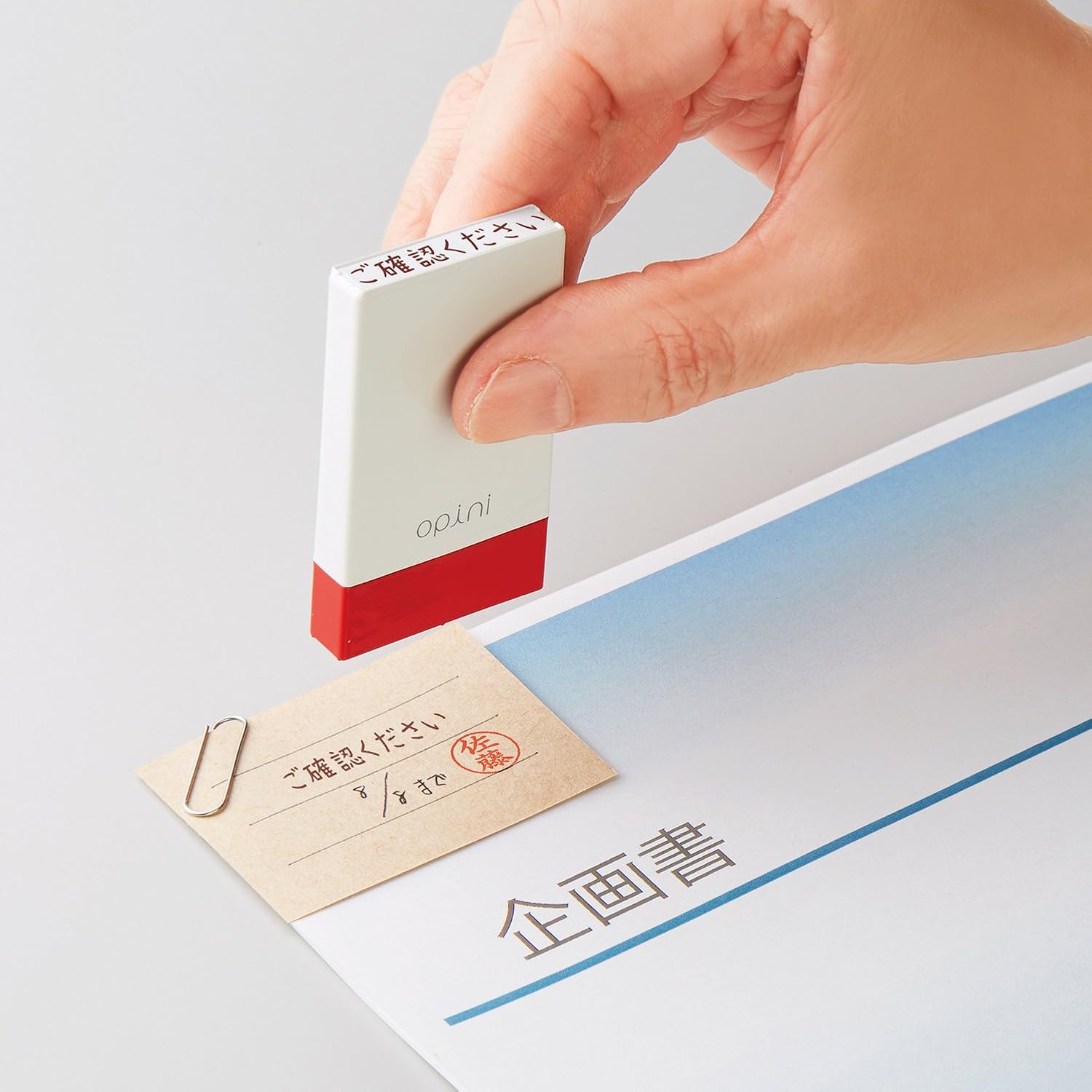 ちょっとした伝言や、契約書、提出書類や 会議資料などの直接書き込むことができない書類へ、手持ちのふせんに捺(お)すだけでメッセージを残せる。