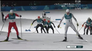 黒いスキーウェアのドイツ3選手が、終始3人で固まって渡部を追い続け、最終盤に追い抜く衝撃のレース展開