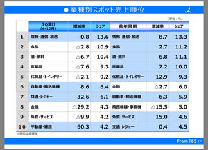 今やスポット広告のスポンサー1位は、情報通信だ。(携帯キャリアやゲーム会社など)