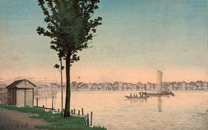 翌年「蛎殻町川辺の図」「富士見渡シ之景」「浅草橋雨中の景」「枕橋の図」「霊岸島高橋の景」(全て横大錦)などを、