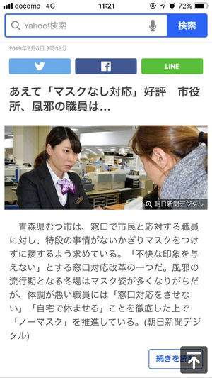 あえて「マスクなし対応」好評 市役所(朝日新聞デジタル) headlines.yahoo.co.jp/hl?a=20190206-… @YahooNewsTopics