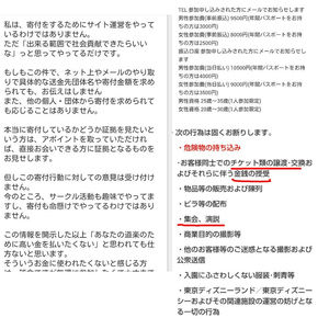 「お客様同士でのチケット類の譲渡・交換およびそれらに伴う金銭の授受」や「集会、演説」、「商業目的の撮影等」といった項目から、商業目的でパスポート料金とは別に金銭を徴収し、パーク内で何かをするという行為は禁止されるであろうという意見。