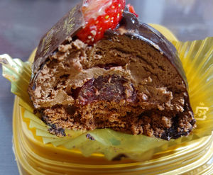 チョコスポンジを土台に、チョコムースやイチゴジュレ、艶やかなグラサージュチョコ、そしてイチゴを乗せた贅沢なケーキ。