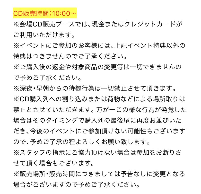 当日会場CD購入特典で直筆サイン入りポストカードが先着でもらえるため、前日23時過ぎには徹夜組が発生