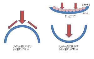 一点に集中した力には弱いものの、全体的な圧力に対しては受けた力が均等に分散され、大きな衝撃にも耐えることができます。