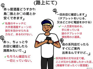 鳥貴族と連絡を取るふりをして「ただいま鳥貴族満席みたいですので、こちらのお店どうですか」とぼったくり店を勧める流れ。(キャッチの常套手段)