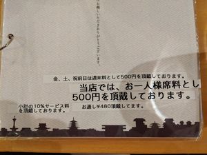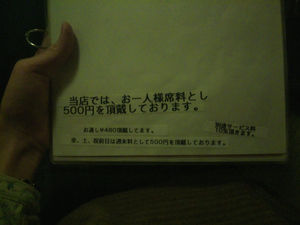 しかし、席料500×人数分、週末料金500×人数分、サービス料10%(勿論消費税とは別)が加算され、トータル7000円近く多い。すかさず文句を言うと、オーダー時説明するかしないかはその席担当の判断に任せている、メニュー表にも書いてある(書いてない)、と意味不明な解答。