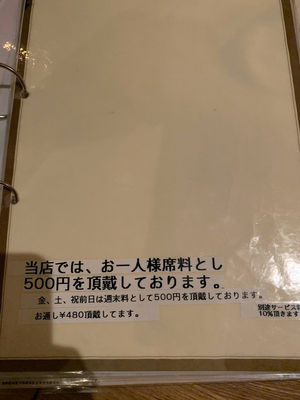 1ドリンク2フードしか頼んでないのに3人で1万以上の会計になり、伝票を見ると週末料金、サービス料、高いお通し代が取られていました。二度と行きません。