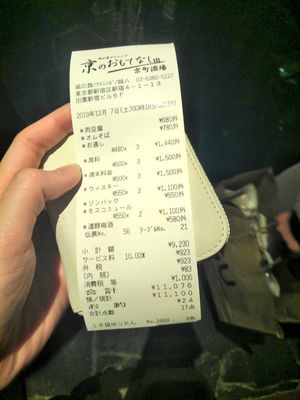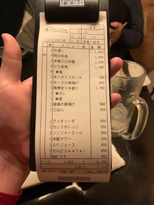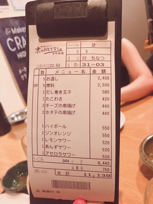 サービス料、席料、お通し、週末料と飲む前からそれなりにお金を取られる。 日本語では”ぼったくり(Bottakuri)”と呼ばれる店。 食べログでは2以下の評価しかないのになぜか”3”が付いている。 これは日本では”大人の事情”と呼ばれる。