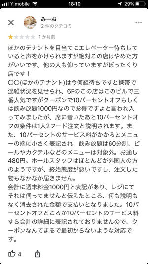 新宿のぼったくり店。キャッチに10%引きクーポンを渡されるもサービス料10%取られるので意味なし。しかもクーポンは正しく適用されず。