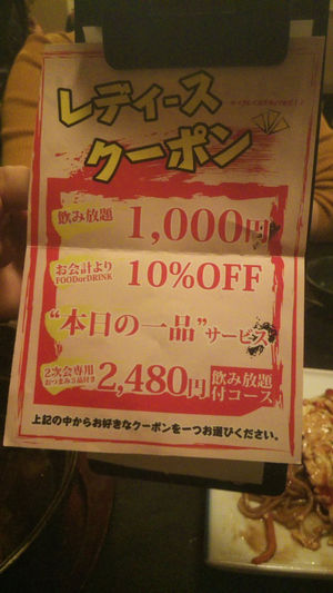 紙を渡され、飲み放題千円か、お会計から10%オフとか選ぶようにされ、店に入ると内装は綺麗なんですが、テーブルがベタベタ。