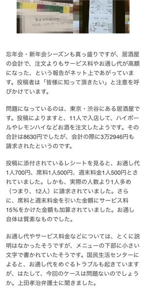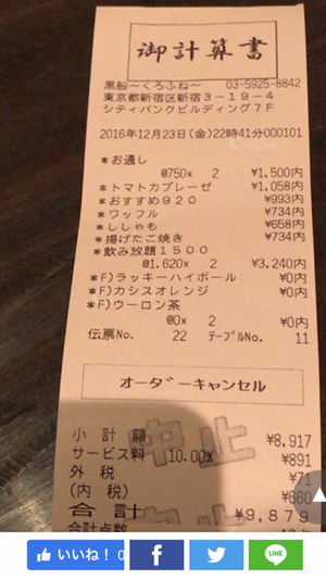 1時間してからお会計の伝票が来たらいわれてもいない席代1人500円、週末料金1人500円、おまけにサービス料金2人で732円。