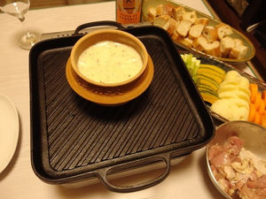 ・グリルパンを温め、その上に釜めしの容器入りチーズを載せ、具材を焼きながら食べる。