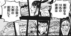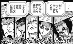 討ち入りに対し用意周到な事についてカイドウ直々に「お前の城にスパイでもいるのかもな」ってしれっと言ってるわけだが、裏切り者についてしのぶ説が濃厚でしたが今週を見る限りシロかな?という感じ。赤鞘の中に裏切り者がいて欲しくないなぁ…という気持ち。