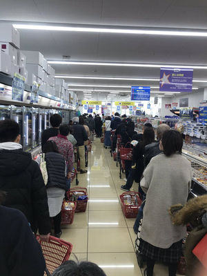 『都知事の会見の影響か夜の21時でスーパーがいつも10倍ぐらい混んでる。 そしてインスタンスラーメンの5パックなどは全て売り切れ』