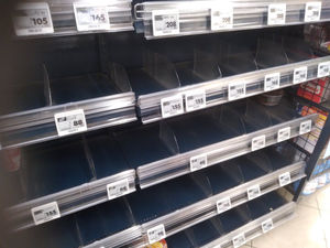 レジは30分待ち。トイレットペーパー、野菜、米、インスタント麺はほとんど無し。写真は鶏肉の棚です。