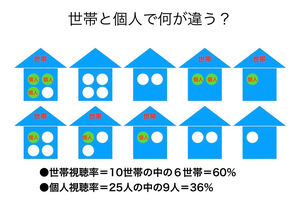 個人視聴率はあくまで「世帯」ではなく「個人」が対象となるため、分母が大きくなり、その分、視聴率の数字自体は小さくなる。例えば、ある番組が世帯視聴率で20%を記録していても個人視聴率は11%、世帯の10%は個人では5・5%という数字が目安となる。