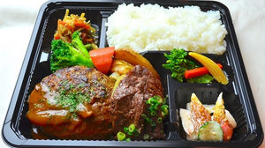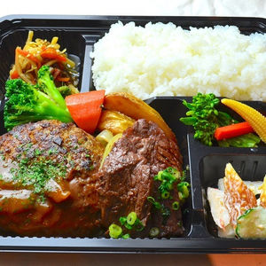 『牛肉100%ハンバーグ&ステーキがセットになった贅沢なお弁当』。