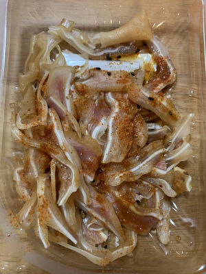 ブラックペッパーが効いてちょっと辛く味付けは醤油風味で少し濃いめ。噛みごたえは十分でビールによく合います。
